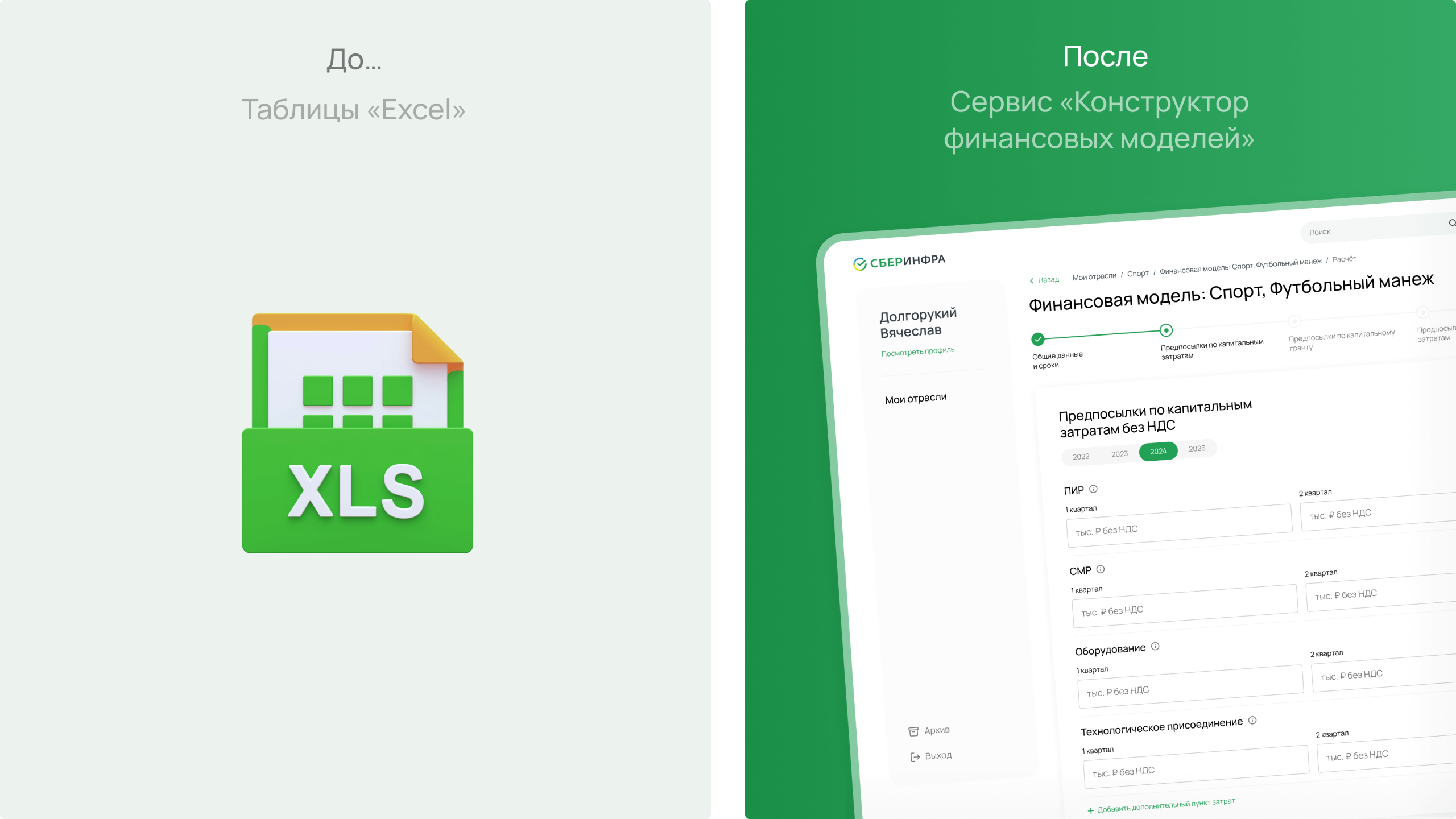 Компания СберИнфра обратилась к нам за разработкой платформенного решения для подготовки финансовых моделей инфраструктурных проектов. Сотрудникам заказчика по запросам клиента приходилось вручную заполнять таблицы в Excel на локальных компьютерах, что было весьма трудозатратно. При малейшем изменении входных данных необходимо было подключать сотрудника заказчика и обрабатывать изменения в ручном режиме.