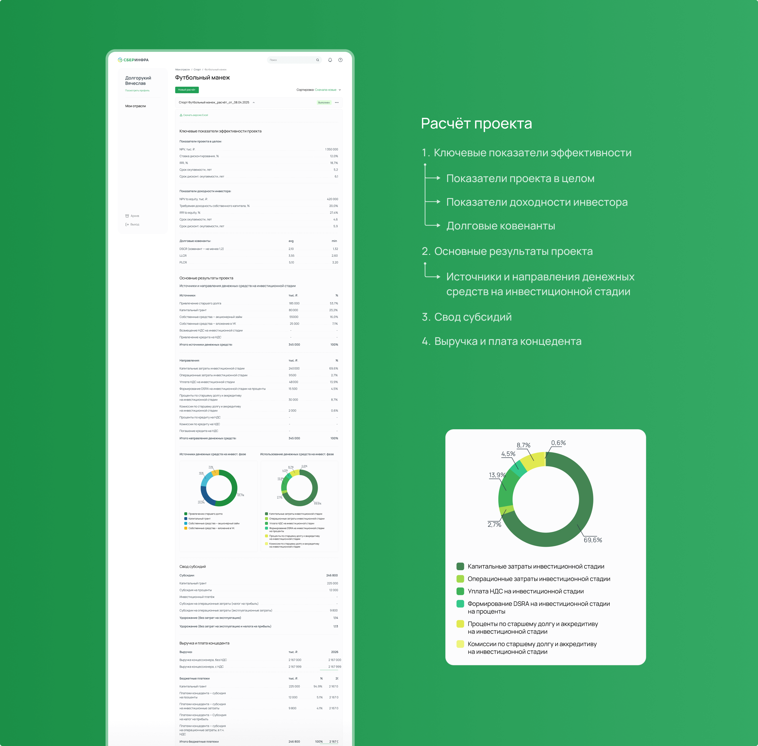 В результате пользователю доступны ключевые показатели эффективности, результаты проекта и другие данные. Расчет проекта также может быть скачан в виде файла.