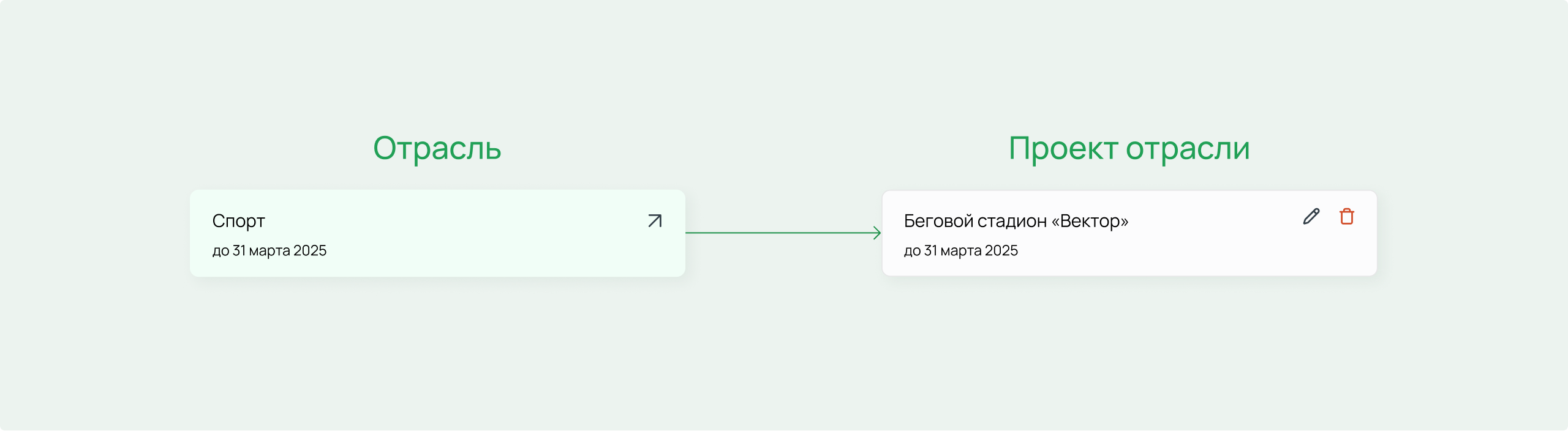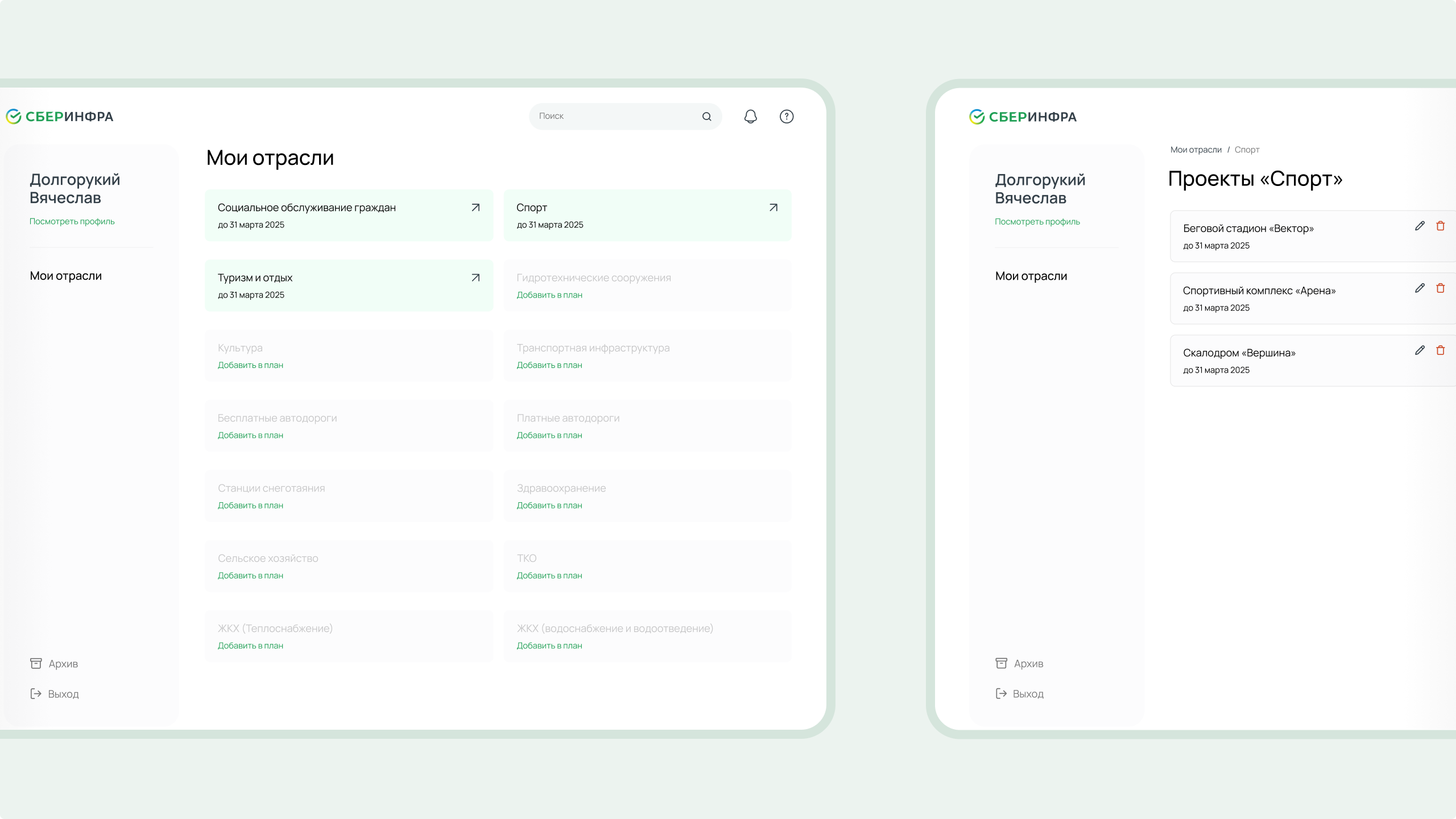Центральный блок кабинета — модуль «Мои отрасли». Отрасли, доступные пользователю, подсвечены, недоступные — затемнены. Внутри одной отрасли пользователь может создавать неограниченное количество проектов.
