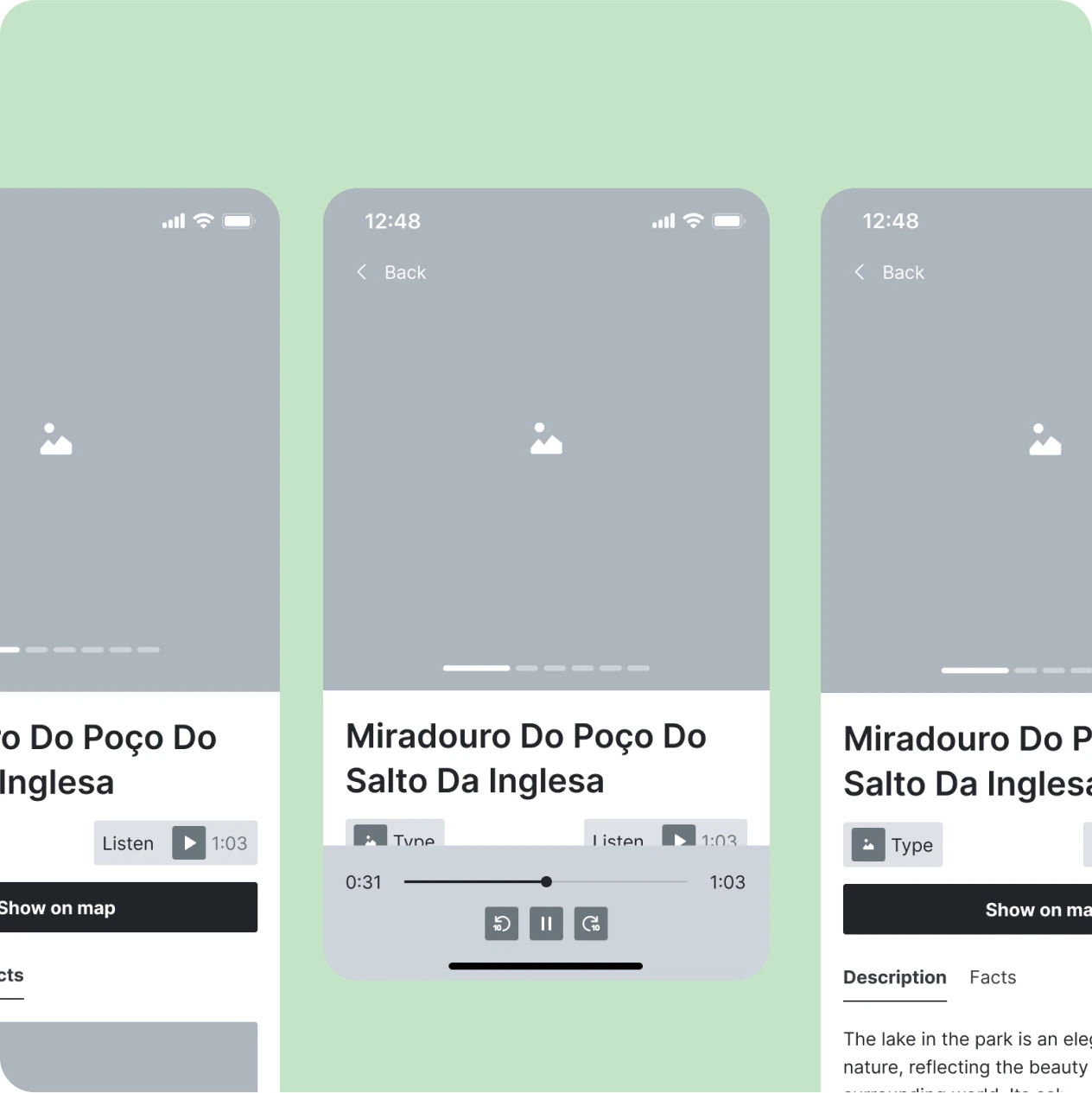 Большая история начинается с точки, а приключения — с карты. Мы подготовили детальный прототип, в котором можно ходить по разделам, понимая логику приложения. Всего 26 экранов, включая вспомогательные разделы.